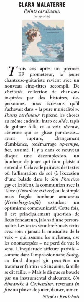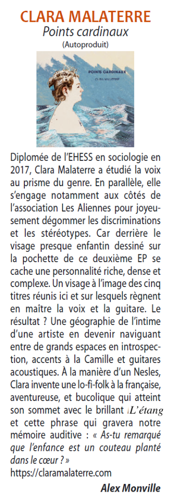 « (….) mais ce petit EP plein comme un œuf (plus riche que bien des albums) n’est pas réductible à une étiquette et a plus d’un tour dans son sac. (…) On aime quand un artiste, après avoir livré sa pensée structurée, s’abandonne au plaisir du son : Clara Malaterre écrit des textes pleins d’idées belles et fortes, mais a l’intelligence de ne pas exclure la légèreté de son propos. (…)»